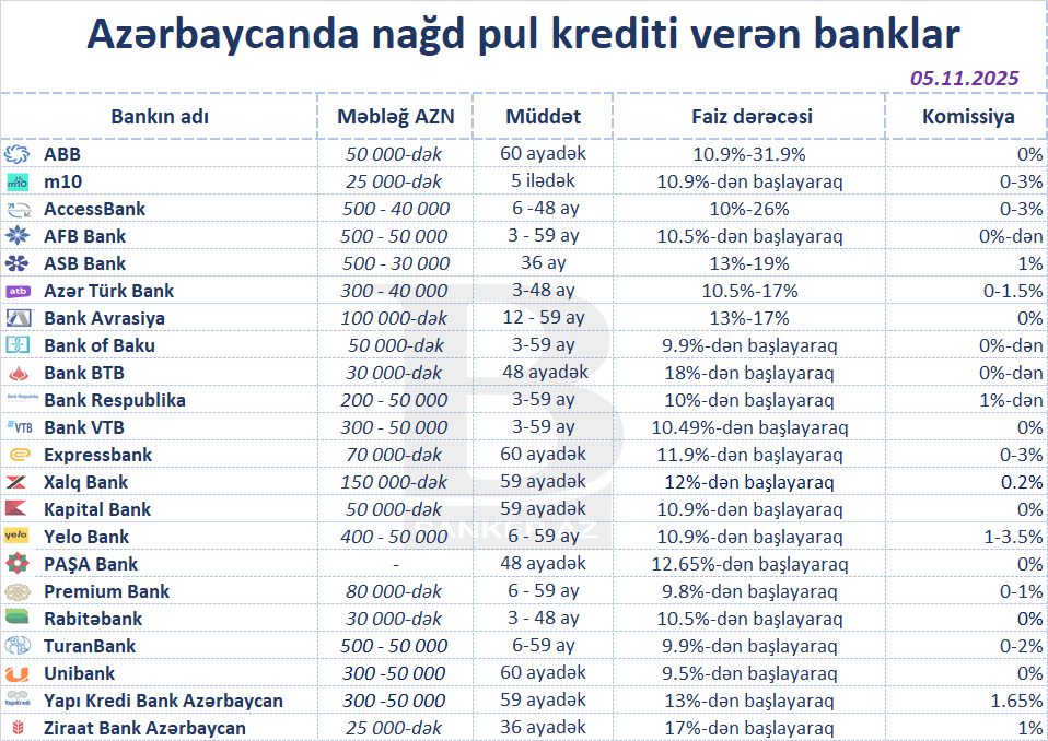 Banker.az olaraq banklarda 2025-ci ilin noyabr ayı üzrə nağd pul kreditinin şərtlərini araşdırıb.