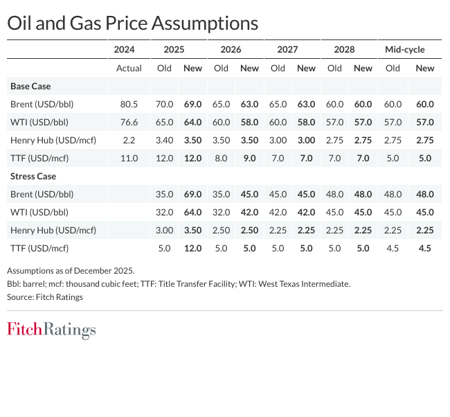 “Fitch Ratings” 2025–2027-ci illər üzrə neft qiyməti proqnozlarını bazarda təklifin artması səbəbindən azaldıb. 2026-cı il üçün TTF qaz qiyməti Avropada qaz balansının daralması nəticəsində 9 ABŞ dolları/ min kub-metrə və ya 317.8 dolları/ 1000 kub-metrə qaldırılıb.