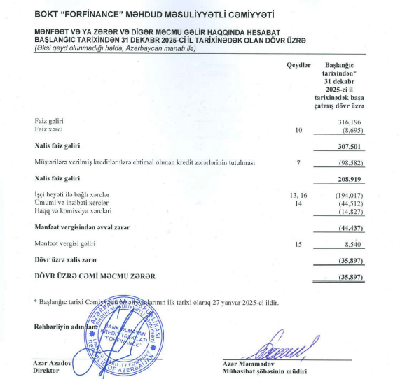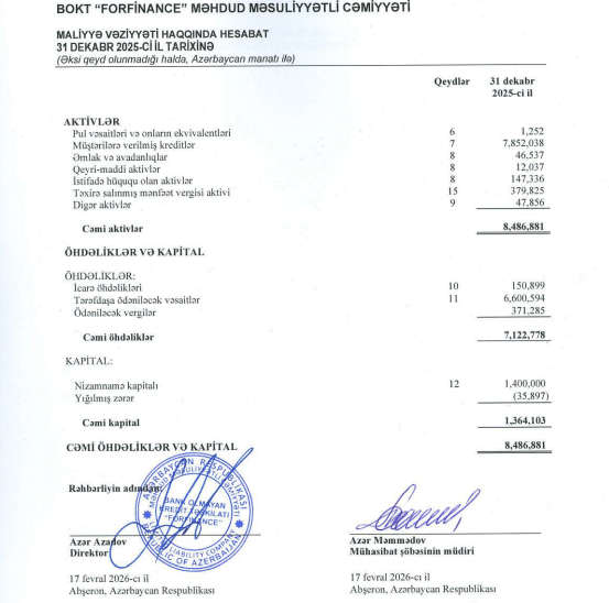 BOKT “Forfinance” MMC 2025-ci il üzrə maliyyə hesabatını açıqlayıb.