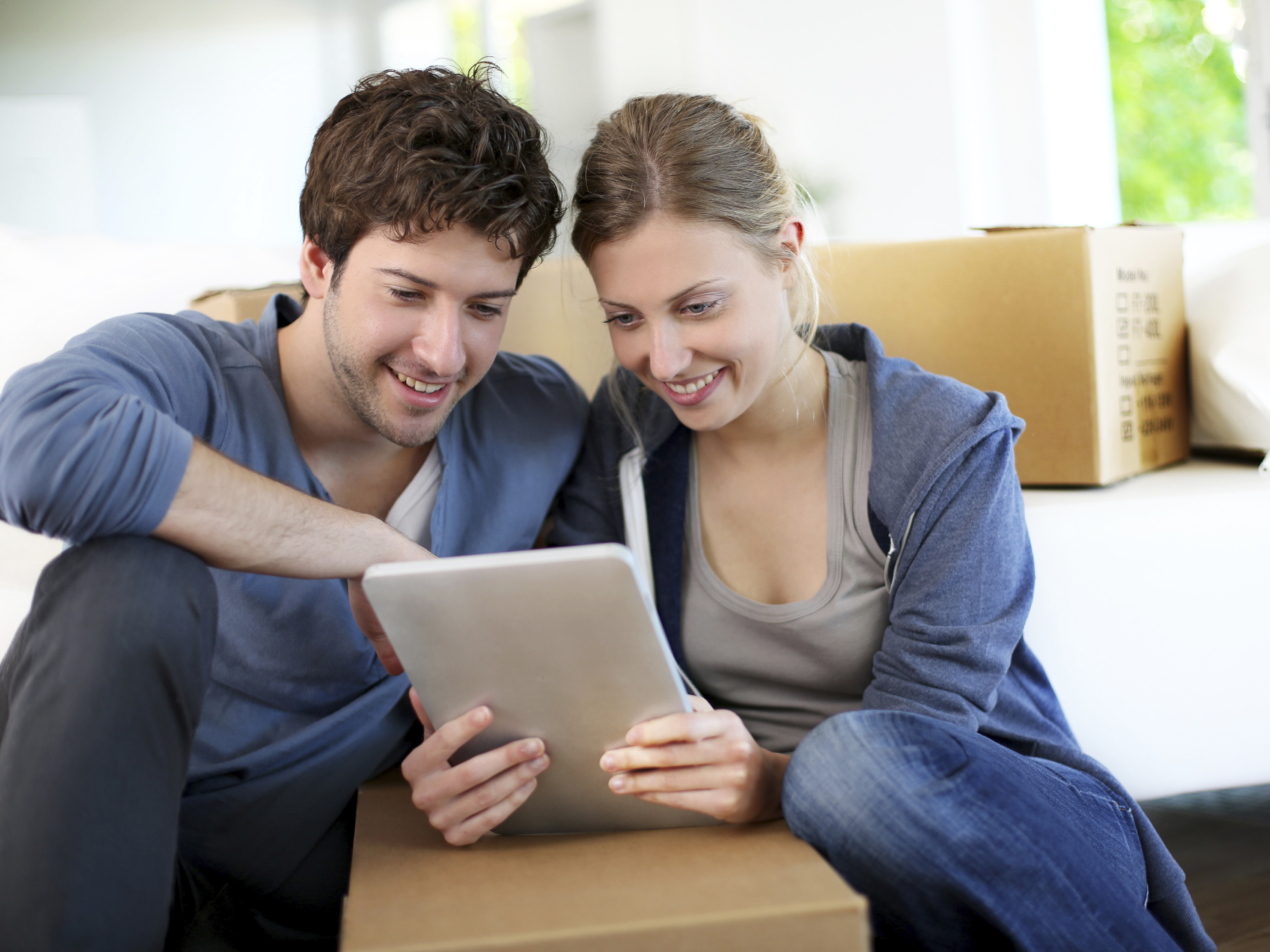 Home Young Couple Smiling at Tablet, Resting on Box Young Couple Smiling at Tablet, Resting on Box