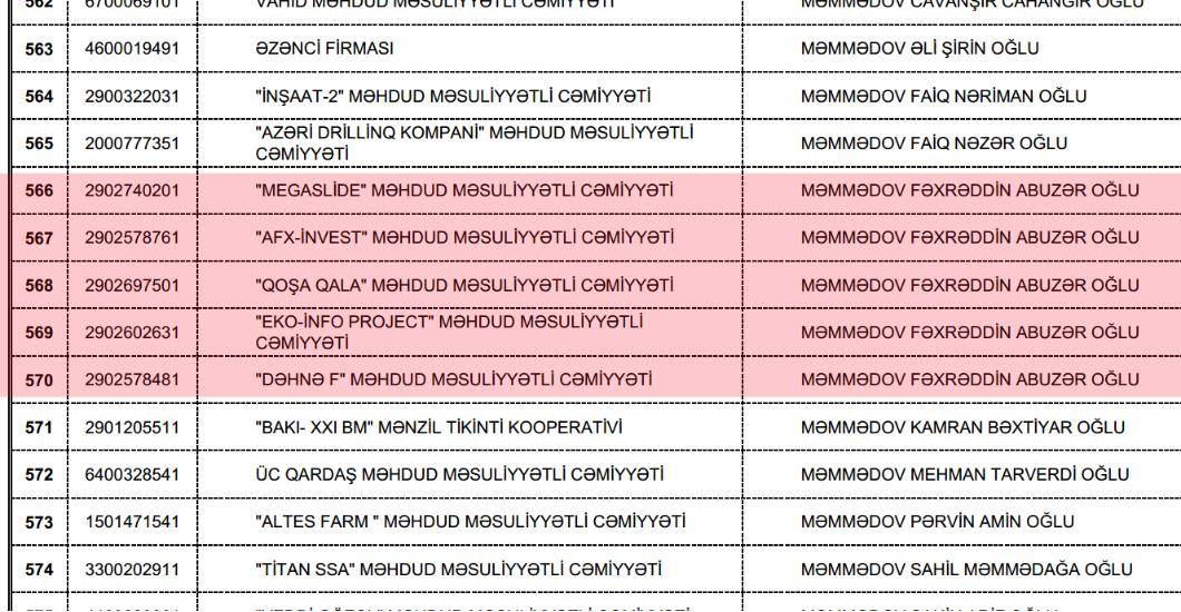 Ötən ilin avqustunda F.Məmmədovun adına Sumqayıt şəhəri, Corat qəsəbəsi, ev 187 A ünvanında qeydiyyatda olan və qanuni təmsilçiləri eyni şəxs olan 11 şirkət ləğv olunmuşdu