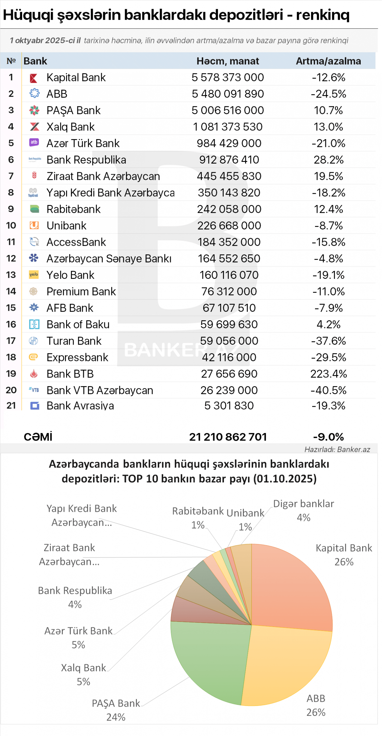 2025-ci ilin 1 oktyabr tarixinə hüquqi şəxslərin banklardakı depozitlərinin ümumi həcmi 21.21 mlrd. manat olub ki, bu da ilin əvvəlindən 9.0% azalma deməkdir.