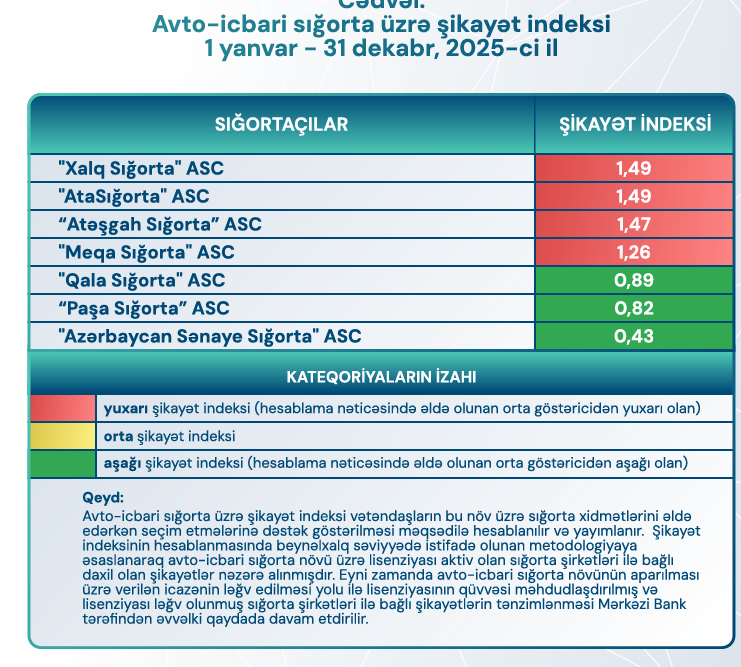 Azərbaycanda avto-icbari sığorta üzrə şikayət indeksi açıqlanıb.