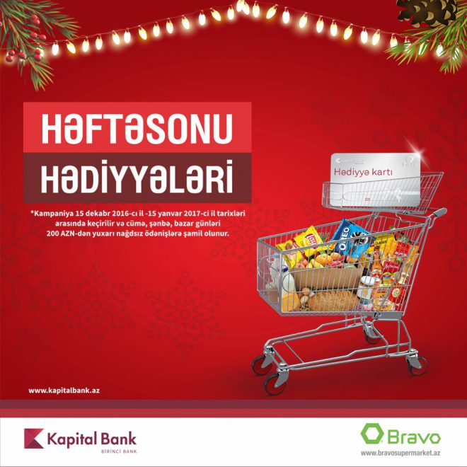 Kapital Bank ölkədə nağdsız ödənişləri stimullaşdırmaq məqsədilə Bravo marketi ilə yeni aksiya keçirir. Şərtlərə görə Gənclik Mall ticarət və əyləncə mərkəzinin 1-ci mərtəbəsində fəaliyyət göstərən marketdə 200 AZN və daha çox məbləğdə alış-verişi istənilən kartla nağdsız şəkildə ödədikdə, 20 AZN-lik hədiyyə kuponu təqdim ediləcək.