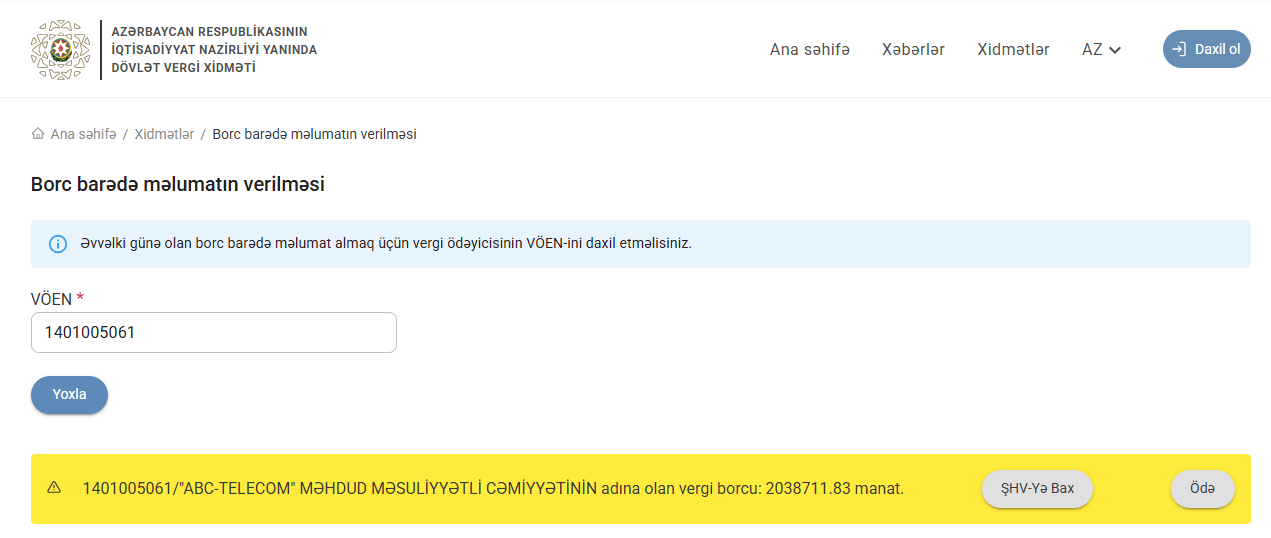 Məlumata əsasən, hazırda “ABC-Telecom” MMC-nin vergi borcu 2 038 711.83 manatdır. Bildirək ki, şirkətin əvvəlki dövrdə 7 672 122.25 manat təşkil edən borcu 6 704 191.98 manata enmişdir. “ABC-Telecom” dövlət büdcəsinə 4 665 480.15 manat borc ödənişi həyata keçirməli olub.