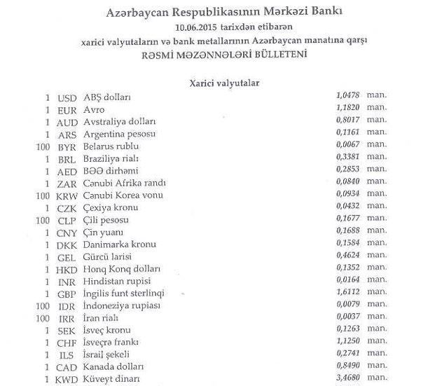 10 İyun tarixində Azərbaycanda 1 ABŞ dollarının manata nisbətdə rəsmi məzənnəsi bahalaşıb.