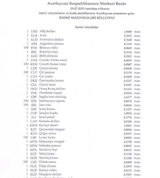 29 İyul tarixində Azərbaycanda 1 ABŞ dollarının manata nisbətdə rəsmi məzənnəsi dəyişməz qalıb.