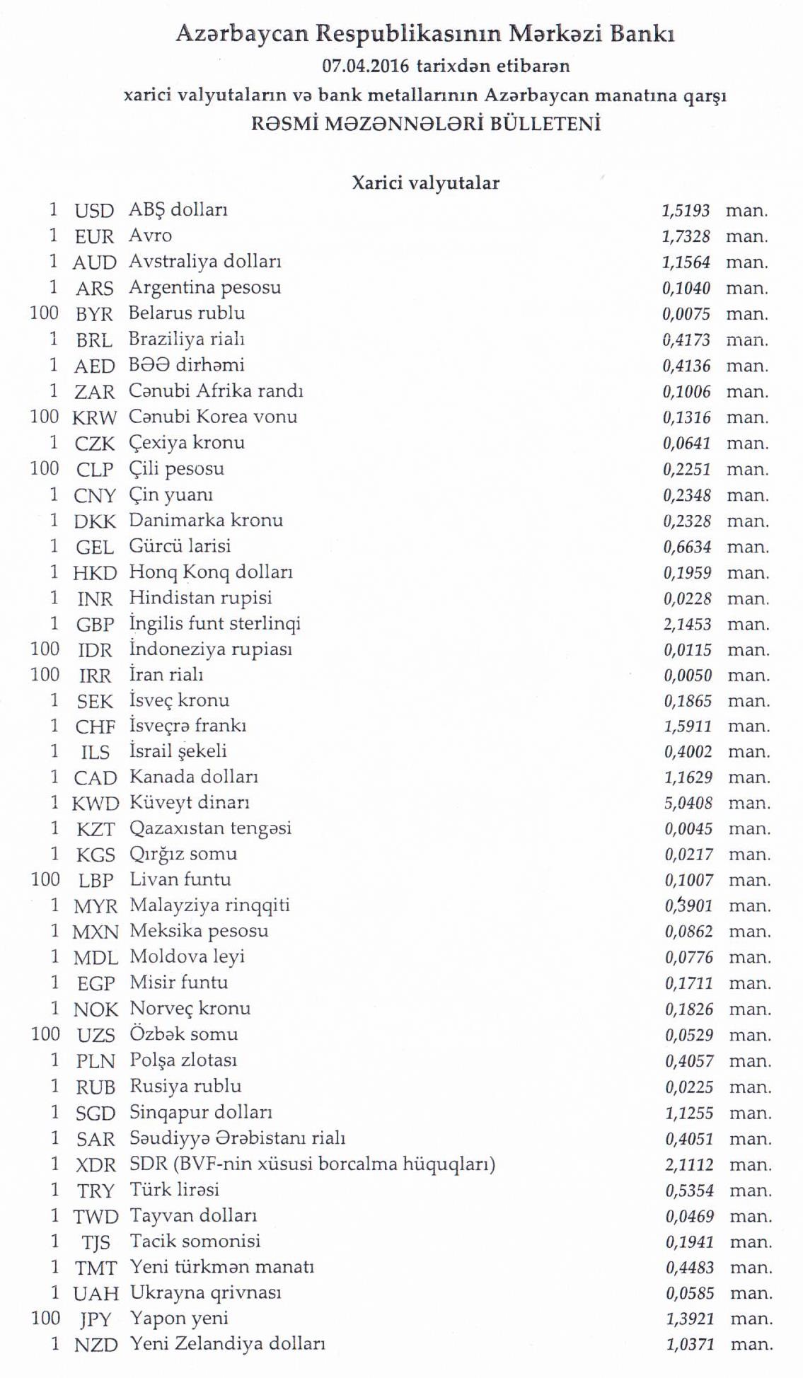 Azərbaycan Mərkəzi Bankı 7 aprel tarixinə valyuta məzənnələrini açıqlayıb.