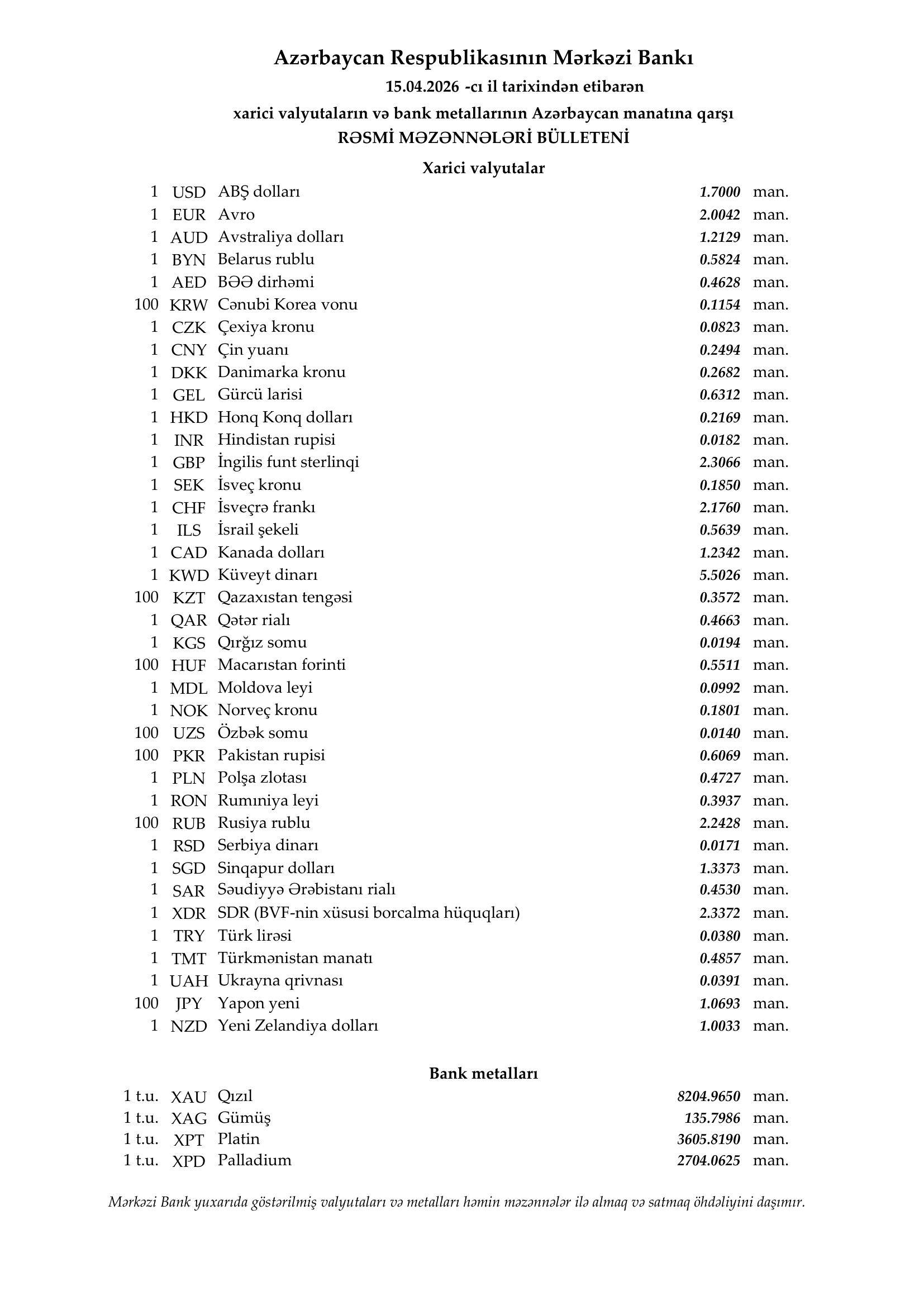 Mərkəzi Bankın rəsmi valyuta məzənnələri – 15.04.2026 Valyuta 15/04/2026 Paylaş FacebookXWhatsAppTelegram Taglarməzənnə Son xəbərlər Qeyri-bank kredit təşkilatları “Brand Credit” BOKT maliyyə vəziyyətini açıqladı 15/04/2026 İnvestisiya ARDNF Çin–ASEAN investisiya platformasına qoşuldu, $520 milyon cəlb edildi 15/04/2026 Ölkə xarici Yaponiya ASEAN ölkələrinə neft alışı üçün $10 milyard ayırır 15/04/2026 Bank xəbərləri “PAŞA Bank”ın kredit portfeli 3.3 mlrd. manatı keçib 15/04/2026 Digər xəbərlər Qeyri-bank kredit təşkilatları “Brand Credit” BOKT maliyyə vəziyyətini açıqladı 15/04/2026 İnvestisiya ARDNF Çin–ASEAN investisiya platformasına qoşuldu, $520 milyon cəlb edildi 15/04/2026 Ölkə xarici Yaponiya ASEAN ölkələrinə neft alışı üçün $10 milyard ayırır 15/04/2026 Bank xəbərləri “PAŞA Bank”ın kredit portfeli 3.3 mlrd. manatı keçib 15/04/2026