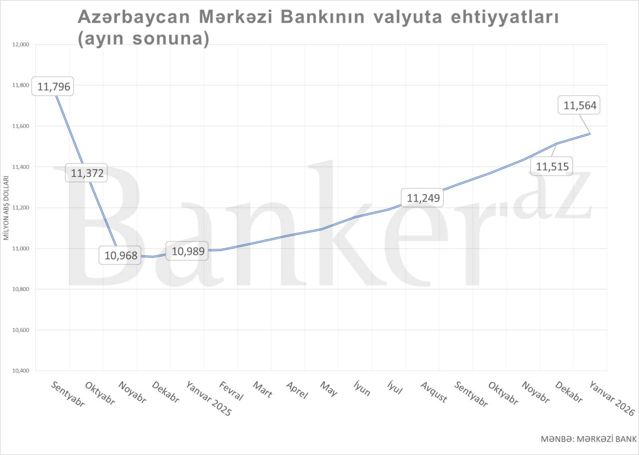 Azərbaycan Mərkəzi Bankının xarici valyuta ehtiyatları 1 fevral 2026-cı il tarixinə 11.56 mlrd. ABŞ dollarını keçib.