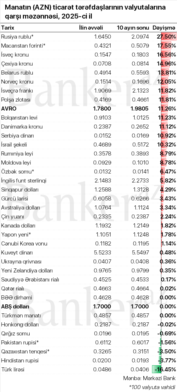 2025-ci ilin ilk on ayı üzrə manatın ticarət tərəfdaşlarının valyutalarına qarşı məzənnəsində açıqlanıb.