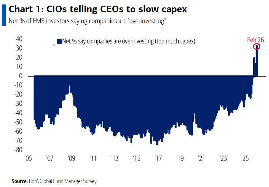 BofA sorğusunun iştirakçılarının dörddə biri bazarlar üçün ən böyük risk kimi “AI köpüyünü” görür, 30%-i isə böyük texnologiya şirkətlərinin AI-yə kapital xərclərinin kredit böhranının ən ehtimal olunan mənbəyi olduğunu bildirir.