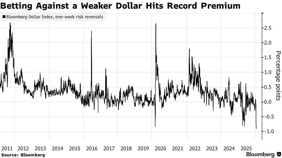 Banker.az xəbər verir ki, ABŞ valyutasının zəifləməsindən qazanc gətirən qısamüddətli opsionlar üzrə mükafat “Bloomberg”in 2011-ci ildən etibarən məlumatları toplamağa başladığı vaxtdan bəri ən yüksək səviyyəyə yüksəlib. Mənfi əhval-ruhiyyə təkcə qısamüddətli seqmentlə məhdudlaşmır — investorlar dolların uzunmüddətli perspektivinə ən azı 2025-ci ilin mayından bəri ən pessimist yanaşmanı sərgiləyirlər.