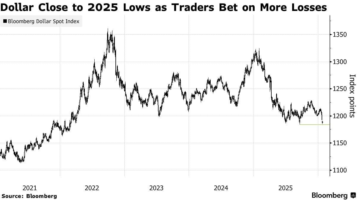 Bu il dollar ən iri 10 ölkənin valyutaları arasında ən zəif göstəriciyə malikdir ki, bu da investorların ənənəvi təhlükəsiz liman aktivinə baxışında dəyişiklik olduğunu göstərir. Valyuta artan ABŞ büdcə kəsirləri, sanksiya riskləri və ticarət gərginlikləri ilə bağlı narahatlıqlardan, həmçinin qızıl və digər ehtiyat aktivlərinə diversifikasiyanın sürətlənməsindən təzyiq altındadır.