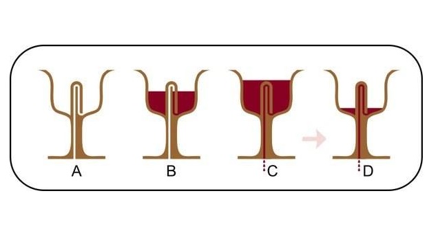 Sözügedən bu effektə nail olmaq üçün qədəhin orta hissəsində iki əyri kanalyaradılmışdır. Onların birinin sonluğu dibdədir, digərin ki isə daxilə açılır. Mayenin daşması Paskal qanununa uyğun olaraq baş verir. Əfsanəyə əsasən, Pifaqor bu qədəhi şərabdan ölçülü şəkildə istifadə etmək və həddindən artıq “görməmiş” insanları cəzalandırmaq üçün ixtira etmişdir.