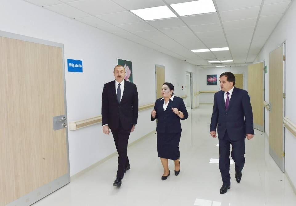 Dövlətimizin başçısı xəstəxananın rəmzi açılışını bildirən lenti kəsib.