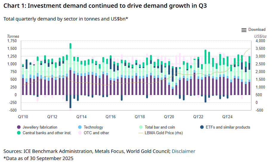 Üçüncü rübdə bazarın əsas hərəkətverici qüvvəsi investorlar olublar. Qızıl ETF-lərinə 222 tonluq iri həcmdə vəsait axını və ardıcıl dördüncü rüb 300 tonu keçən fiziki qızıl (külçə və sikkə) tələbi — bu dəfə 316 ton — ümumi artımı dəstəkləyib.