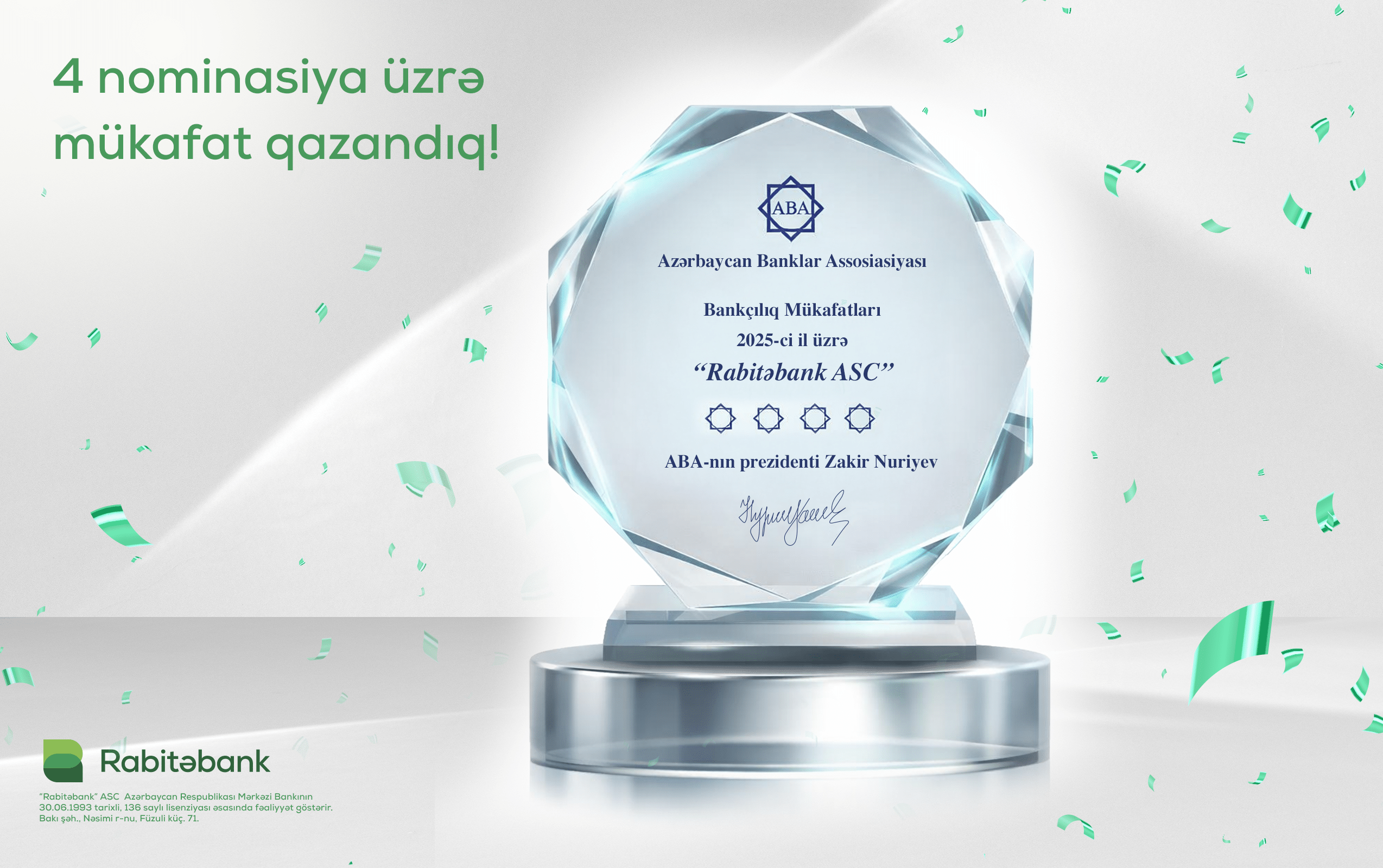 ®Rabitəbank Azərbaycan Banklar Assosiasiyası (ABA) tərəfindən təşkil olunan “Bankçılıq Mükafatları – 2025” tədbiri çərçivəsində 4 mühüm nominasiya üzrə mükafata layiq görülüb. Bankın il ərzində həyata keçirdiyi çoxşaxəli fəaliyyətlər, innovativ yanaşmaları və sosial məsuliyyət təşəbbüsləri nüfuzlu mükafatlarla yüksək qiymətləndirilib.