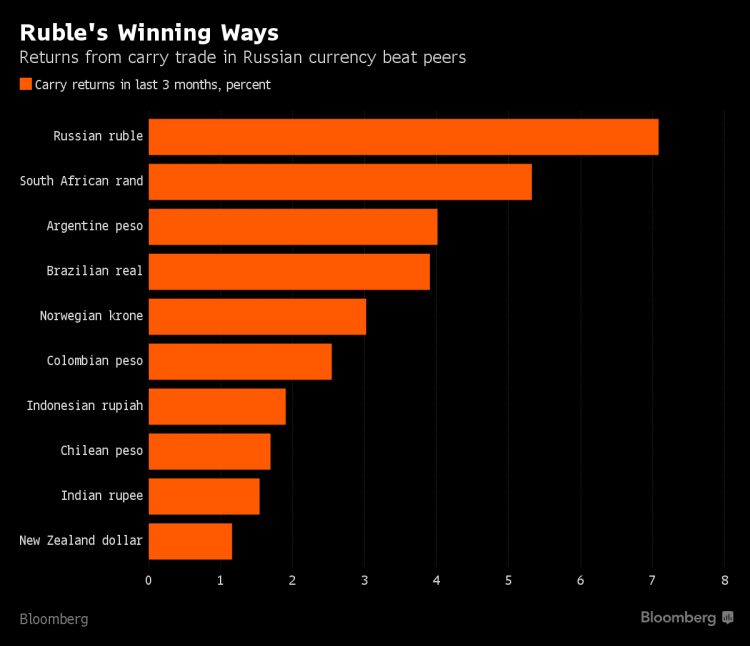 Son aylar ərzində Rusiya rublunun zəifləməsinə baxmayaraq, ekspertlər qonşu ölkənin milli valyutasında olan aktivlərdən imtina etməməyi tövsiyə edir. Təkcə son 3 ay ərzində 0% dərəcəsi ilə dollar əldə edən və həmin vəsaiti rublda olan aktivlərin yatıran investorlar 7% gəlir əldə edib ki, TOP-10-a daxil olan heç bir valyuta bu səviyyədə gəlirliliyi təmin edə bilməyib. Bunu “Bloomberg”in sorğu keçirdiyi ekspertlər deyir.