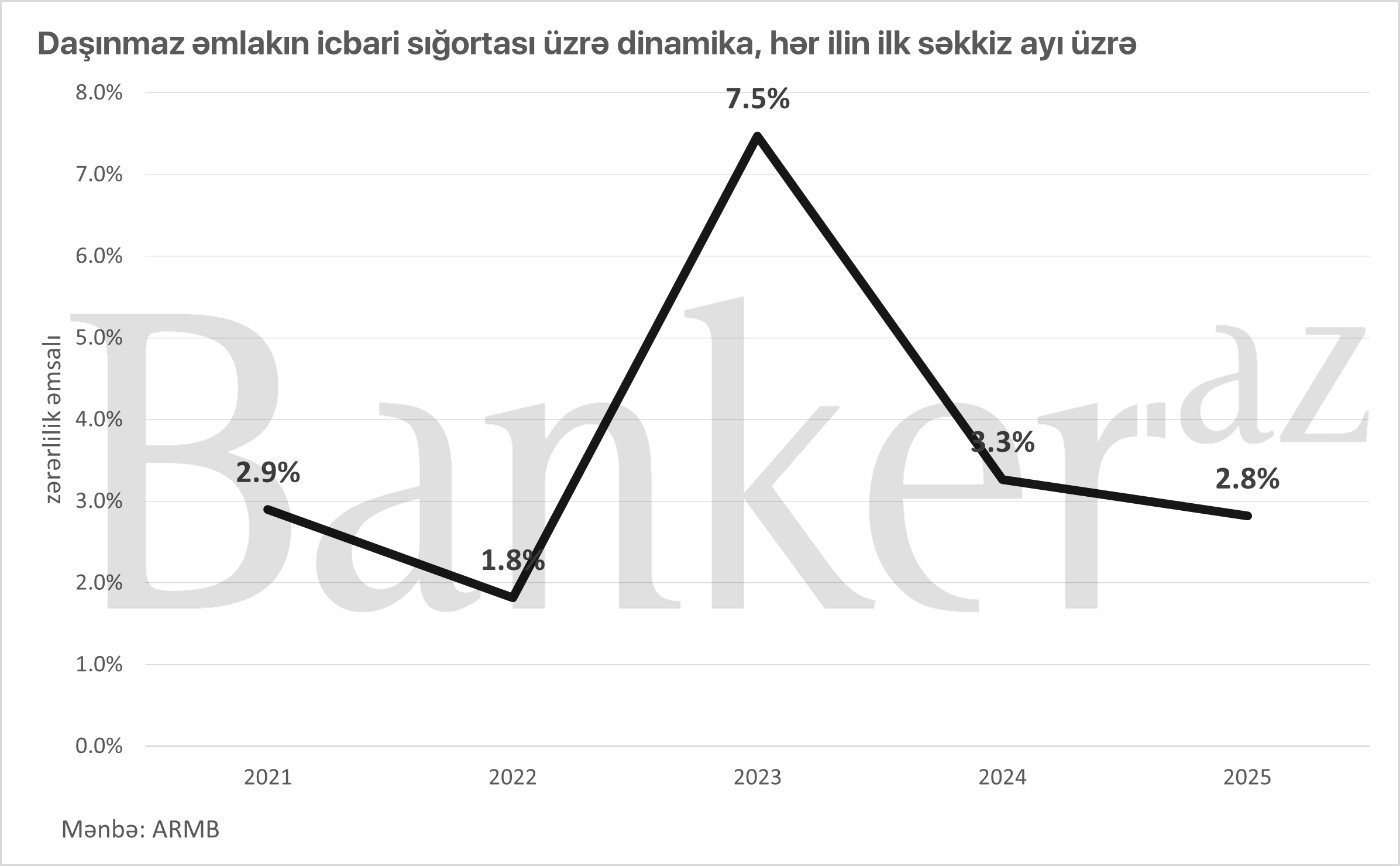 2022-ci ildə bu göstərici 1,8%-ə, 2023-cü ildə isə 7,5%-ə yüksəlib. Lakin sonrakı illərdə əmsal azalma meyli göstərib — 2024-cü ildə 3,3%, 2025-ci ildə isə 2,8% səviyyəsində formalaşıb. Bu da o deməkdir ki, daşınmaz əmlakın icbari sığortasında cəlb edilən hər 100 manat sığorta haqqının 3 manatdan aşağı hissəsi ödənişə yönəldilib. Hazırkı göstərici ilə sektorda sığorta şirkətləri üçün ən yuxarı mənfəətli olan sığorta alətindən biridir.