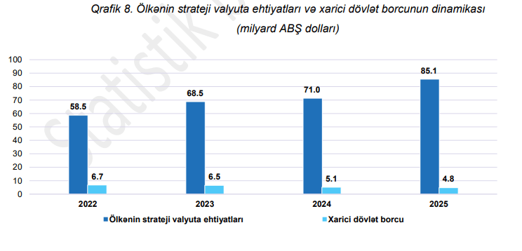 Ölkənin strateji valyuta ehtiyatlarını formalaşdıran Azərbaycan Respublikası Dövlət Neft Fondu və Azərbaycan Respublikasının Mərkəzi Bankı cəmi ehtiyatları 1 yanvar 2026-cı il tarixinə 85,1 milyard ABŞ dolları məbləğində olub.