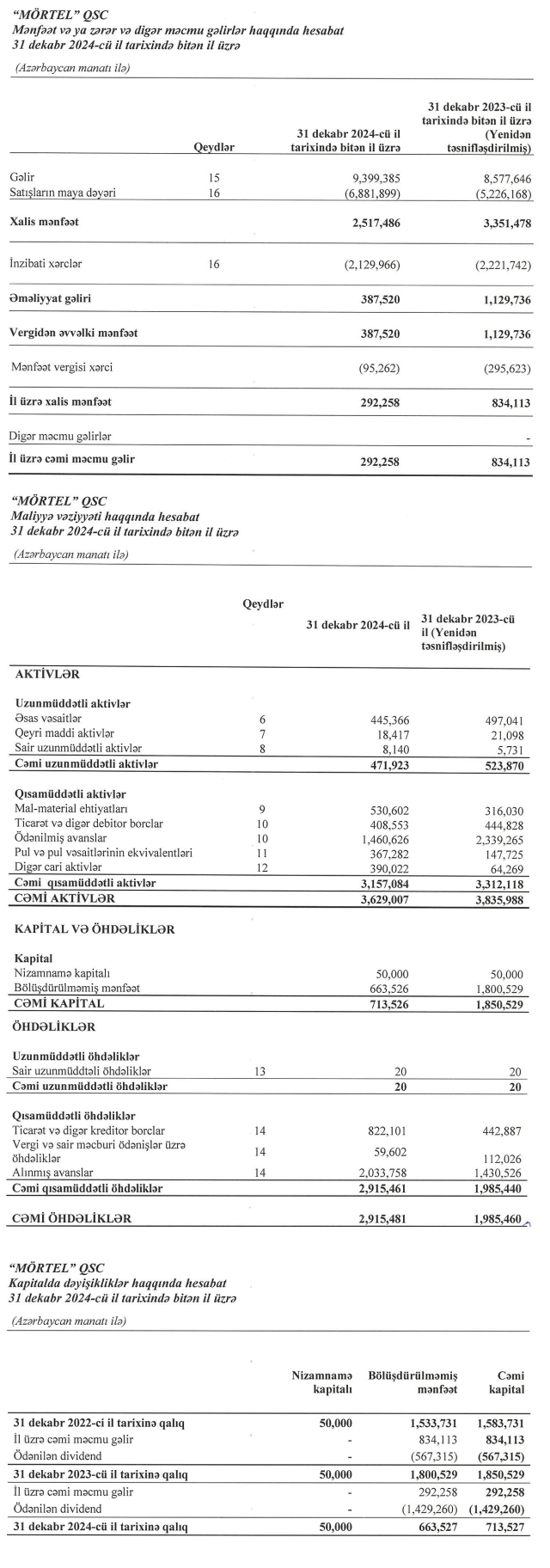 “Mörtel”in gəlirləri 2023-cü illə müqayisədə artaraq 8,6 milyon manatdan 9,4 milyon manata yüksəlib. Lakin satışların maya dəyərinin 5,2 milyon manatdan 6,9 milyon manata qalxması nəticəsində xalis mənfəət azalmasına təsir edib. Əməliyyat gəliri 1,13 milyon manatdan 387 min manata düşüb.