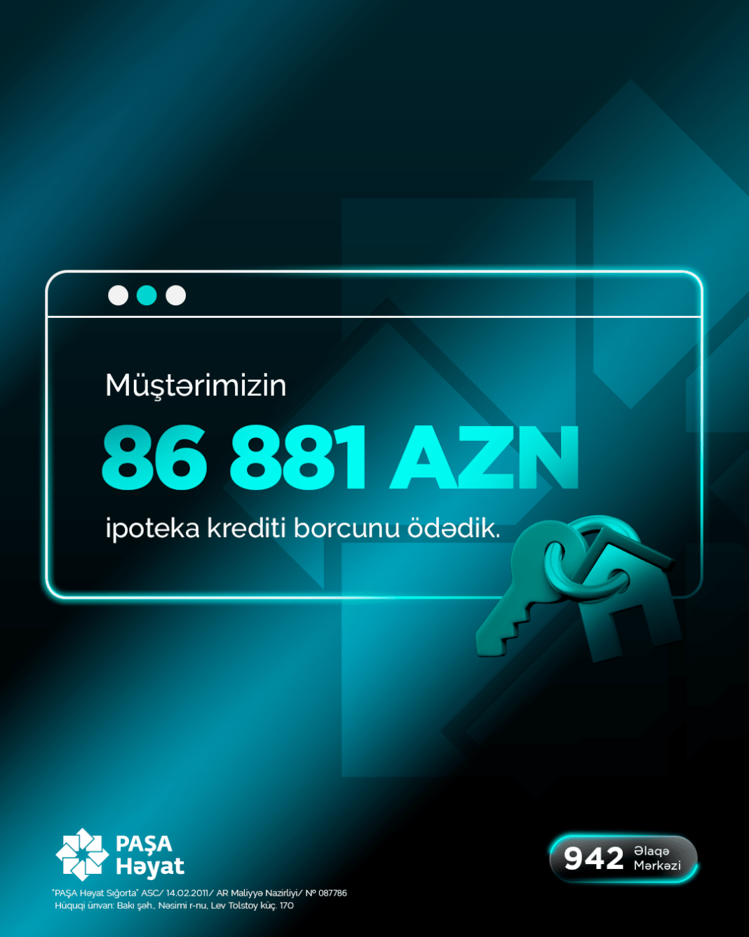 İpoteka krediti götürmüş şəxsin vəfat etməsi nəticəsində müştərinin 86 881 manat qalıq borc məbləği “PAŞA Həyat Sığorta” ASC tərəfindən aidiyyəti üzrə ödənilib.