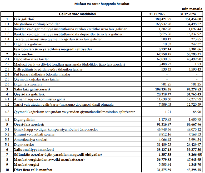 Depozitlər 1,09 milyard manat olub, 18% artaraq əsasən fiziki şəxslərin depozitləri ilə dəstəklənib. Müştərilərə verilmiş kreditlər 1,06 milyard manata yüksələrək 16% artım göstərib, istehlak və biznes kreditləri bankın portfelinin əsas hissəsini təşkil edir.