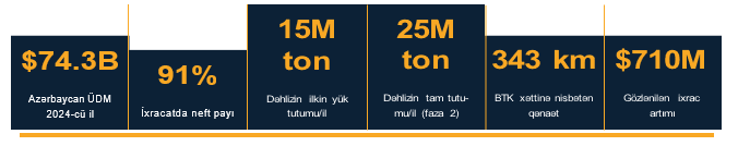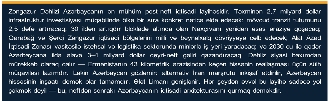 Azərbaycan iqtisadiyyatı onilliklər boyu neft və qaza söykənib. Bu resurslar ixracat gəlirlərinin 91 faizini, Ümumi Daxili Məhsulun isə təxminən yarısını təşkil edir. 2024-cü ildə ölkənin ÜDM-i 74,3 milyard dollar səviyyəsinə çatıb, lakin qeyri-neft sektorunun payı hələ də arzulanan səviyyədə deyil. Hökumətin uzunmüddətli strategiyası isə aydındır: neftdən asılılığı azaltmaq, logistika və tranziti yeni iqtisadi mühərrikə çevirmək. Bu strategiyanın mərkəzində isə Zəngazur Dəhlizi durur.