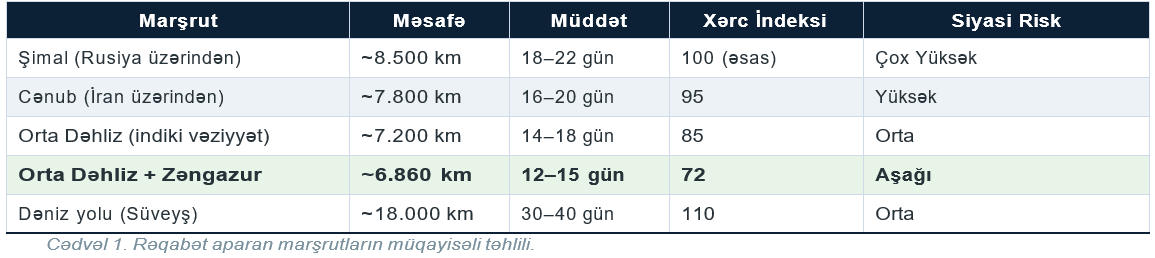 Zəngazur Dəhlizini tam anlamaq üçün onu Avrasiya tranzit rəqabəti kontekstinə düşünmək lazımdır. Avropa ilə Asiya arasındakı illik ticarət həcmi 700 milyard dolları keçir. Tarixən iki əsas quru marşrutu bu dövriyyəni daşıyırdı: Şimal Dəhlizi (Rusiya üzərindən) və Cənub Dəhlizi (İran üzərindən). Lakin 2022-ci ildən etibarən Rusiyaya tətbiq edilən sanksiyalar Şimal Dəhlizini ciddi şəkildə zəiflətdi. İranın beynəlxalq izolyasiyası isə Cənub Dəhlizini böyük ticarət axınları üçün qeyri-etibarlı edib
