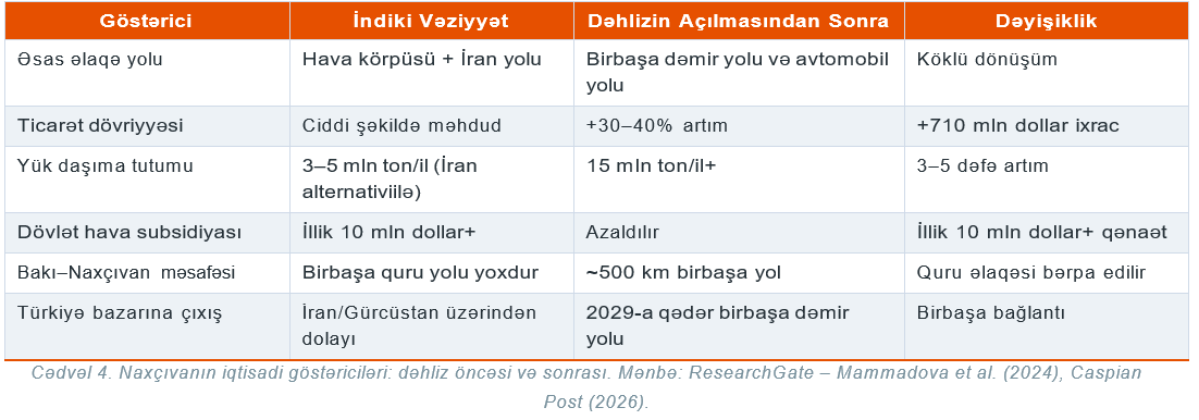 Dəhlizin açılması bu dəngəni kökündən dəyişdirəcək. Birbaşa dəmir yolu və avtomobil yolu bağlantısı Naxçıvanın Azərbaycanın əsas ərazisi ilə ticarətini, turistik cəlbediciliyini və sənaye potensialını dramatik şəkildə artıracaq. Alternativ İran marşrutu — Araz dəhlizi — da eyni zamanda inkişaf etdirilir ki, bu da marşrutun müxtəlifliyini və dayanıqlığı artırır.