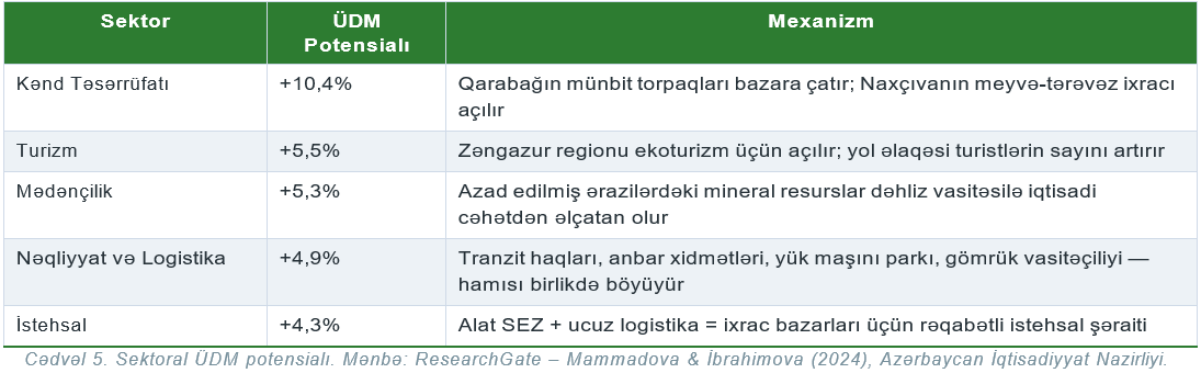 Zəngazur Dəhlizinin Azərbaycan iqtisadiyyatına təsiri çoxşaxəlidir. Yalnız nəqliyyat haqqından deyil, Qarabağın yenidən qurulmasından, Naxçıvanın iqtisadi canlanmasından, Ələt Azad İqtisadi Zonasının inkişafından və qeyri-neft sektorunun genişlənməsindən söhbət gedir. Aşağıdakı cədvəl əsas sahələr üzrə gözlənilən dəyişiklikləri ümumiləşdirir.