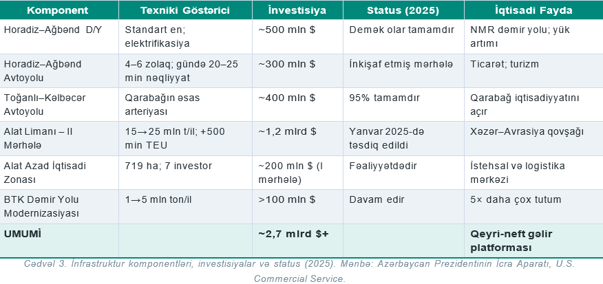 Azərbaycan artıq gözləmir. Dəhlizin Azərbaycan hissəsinin dəmir yolu inşaatının 70%-i, avtomobil yolunun isə 70%-i 2022-ci ilə qədər tamamlanmışdır. 2025-ci ildə Ələt Limanının II mərhələsi — 1,2 milyard dollarlıq investisiya ilə tutumu 15 milyon tondan 25 milyon tona qaldıracaq layihə — rəsmən təsdiqlədi. Toğanlı–Kəlbəcər avtomobil yolu 95% hazırdır. Bütün bu addımlar birlikdə Azərbaycanın logistika platformasını formalaşdırır.